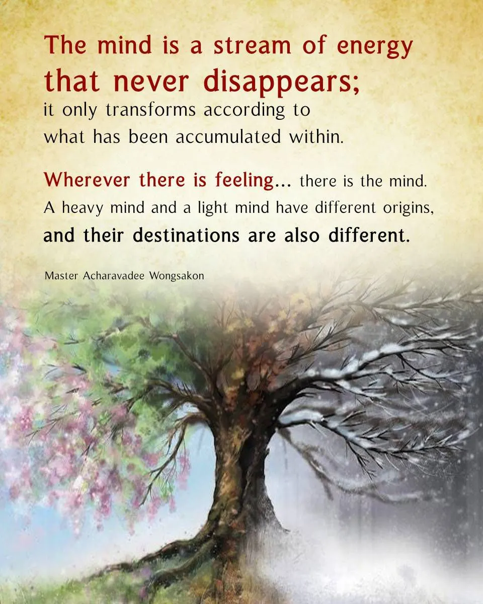 The Buddha discovered that all things are a stream of energy that is constantly changing. The mind is also an energy (mind energy), and it is very powerful. It can command the brain and send signals to different parts of the body, influencing thoughts, speech, and actions.